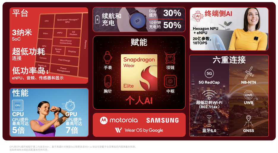 - 骁龙可穿戴平台至尊版在边缘侧赋能个人AI,支持包括手表、胸针、吊坠等在内的多种形态,带来个性化的交互与洞察。